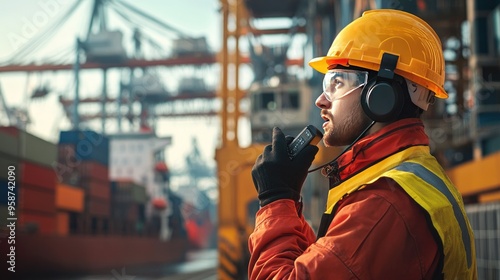 Close-up of a port worker wearing safety gear, communicating via radio amidst a backdrop of ships and containers.