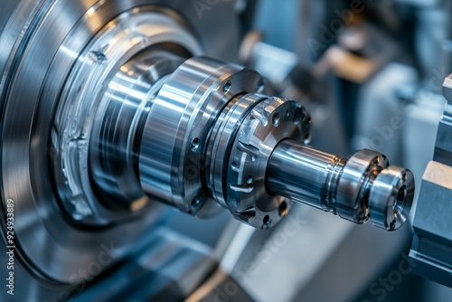 Close-up of a precision metalworking machine in operation, showcasing detailed metal components and machinery in an industrial setting.