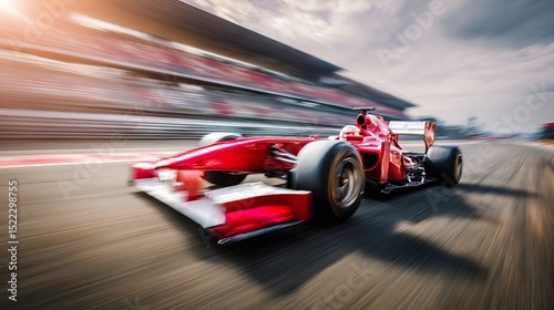 Close-up of a racing car speeding on the track with motion effect and vibrant colors, showcasing speed, adrenaline, and high-performance motorsports competition.