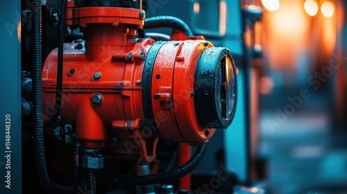 compressor, engine, machinery, industrial, technology, equipment, red, metal, steel, part, component, detail, closeup, texture, background, power, energy, factory, manufacturing, production, industry, mechanic, engineering, mechanism, apparatus, contraption, device, system, construction, automotive, vehicle, transportation, air, pressure, valva, pipe, tube, wire, cable, droplet, water, wet, damp, night, urban, city, bokeh, light, orange