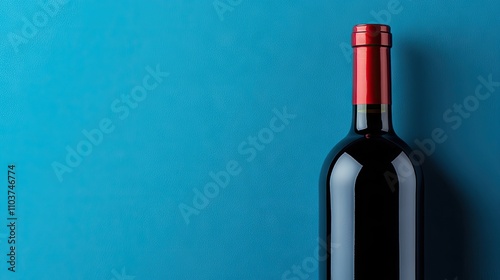 Close-up of a red wine bottle set against a blue background, highlighting the rich color of red wine with ample copy space for text or design elements.