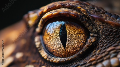 Close-up of a reptilian eye showcasing intricate textures and colors.