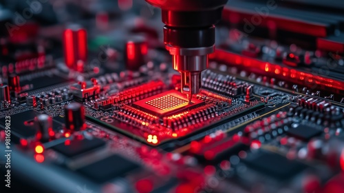 robot, soldering, microchip, circuit, board, electronic, technology, precision, manufacturing, automation, semiconductor, red, light, industry, machinery, assembly, robotic, arm, pcb, connection, component, innovation, production, processor, chips, engineering, equipment, detail, electrical, hardware, factory, system, closeup, tool, industrial, motherboard, artificial, intelligence, programming, energy, futuristic, mechanic, development, laser, control, digital, design, network