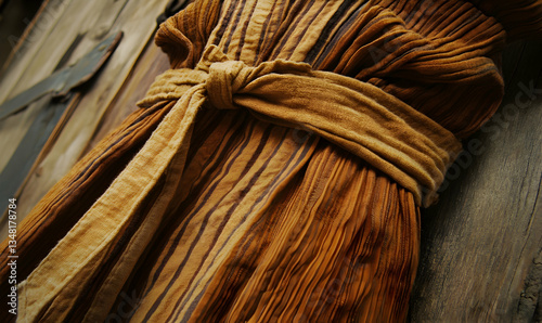Close-up of a rustic, brown striped fabric with a tied belt, hanging against a weathered wooden background. The texture and earthy tones evoke a sense of warmth and nostalgia.