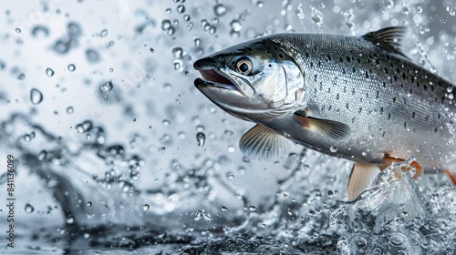 Close-up of a salmon leaping out of water, scales glistening, light background, isolated, studio lighting, splash detail