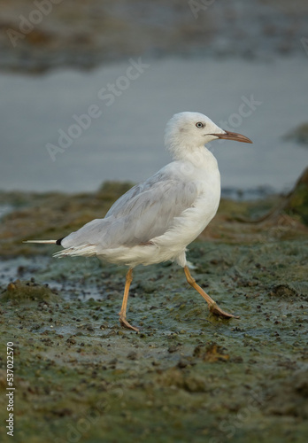 Closeup of a Sender-billed gull at Arad coast, Bahrain