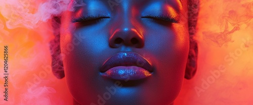 woman, face, beauty, skin, eye, lip, serene, calm, peaceful, smoke, red, blue, light, colours, vibrant, illuminated, closeup, portrait, model, female, expression, emotion, sensual, mysterious, dark, shadow, art, fashion, style, make-up, hair, glow, texture, abstract, fantasy, dream, atmosphere, mood, background, studio, photo, image, picture, graphic