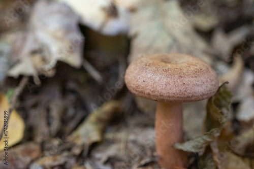 Close-up of a single brown mushroom growing on forest floor among dry autumn leaves.