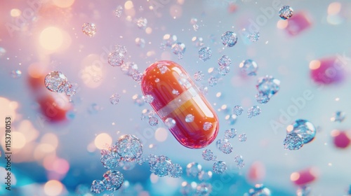 Close-up of a single capsule suspended in water droplets against a bokeh background.