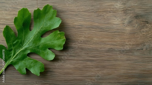 Close-up of a single green leaf on a wooden surface. the leaf appears to be fresh and healthy, with a pointed tip and a serrated edge. the wood has a dark brown color with visible grain and texture.