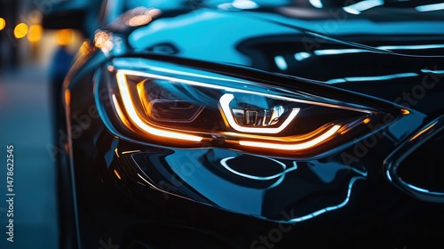Close-up of a sleek black car's headlight, showcasing modern design and glowing LED lights