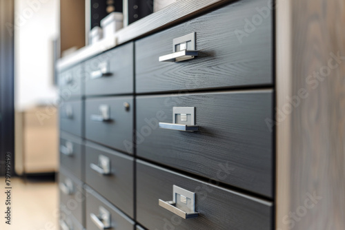 Closeup of a sleek, modern office cabinet stands against a wall, its clean lines and minimalist design exuding professionalism.