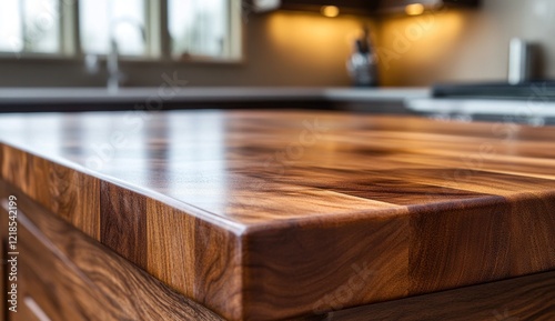 Close-up of a sleek, polished walnut wood kitchen island countertop.