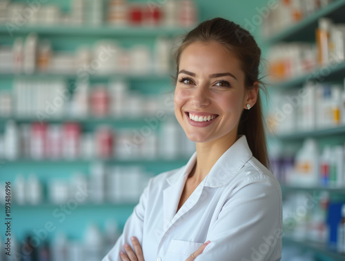 Close-up of a smiling female pharmacist inside a pharmacy
