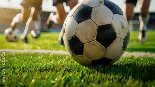 close-up of a soccer ball on a field with players' legs in motion, capturing the intensity of the game