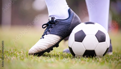 soccer, football, player, foot, shoe, ball, grass, field, sport, game, competition, athlete, action, standing, ready, sharpened, sporting, equipment, professional, training, match, ground, white, black, detail, closeup, active, athletic, gameplay, grassy, playing, footwear