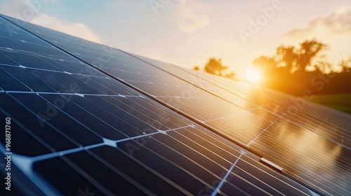 Close-up of a solar panel in a high-tech setting, reflecting the bright sun, representing sustainable energy solutions