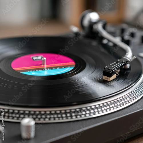 Close-up of a spinning vinyl record on a classic turntable.