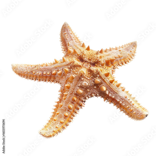 Close-up of a starfish. Light orange-tan color, small, distinct spines. Five-pointed, flattened body