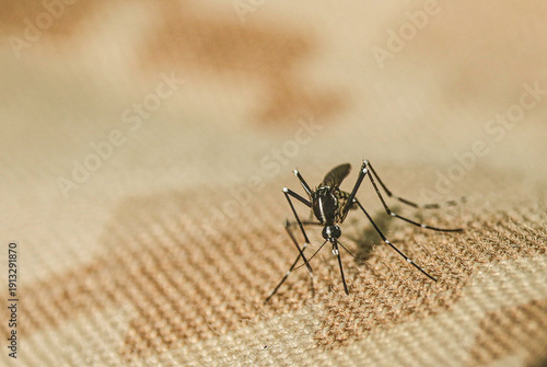 Close-up of a striped mosquito on a patterned fabric surface
