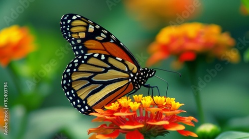Close-up of a stunning monarch butterfly perched gracefully on a blooming flower, its intricate patterns on full display.