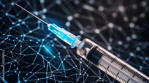 Close-up of a syringe with a glowing blue light illuminating the needle, set against a dark, high-tech background