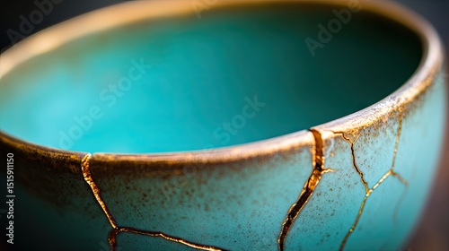 Close-up of a teal ceramic bowl with intricate gold cracks.