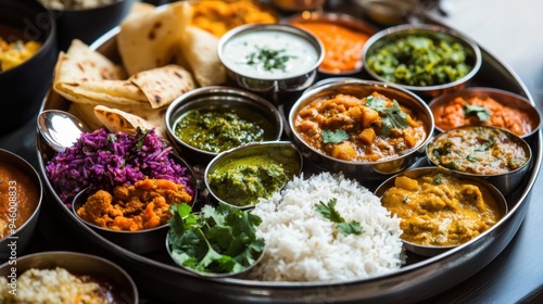 Close-up of a thali platter filled with a variety of Indian dishes like dal, rice, sabzi, pickles, and papad, showcasing the diversity and richness of Indian flavors and culinary traditions