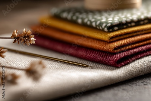Close-up of a Threaded Sewing Needle Beside Folded Fabric Pieces