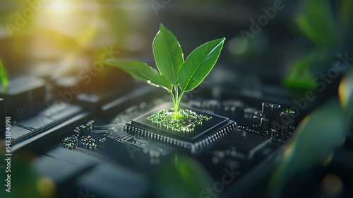 Close-up of a tiny plant emerging from the silicon surface of a computer chip, with technology and nature blending seamlessly, highlighting the future of green, sustainable computi