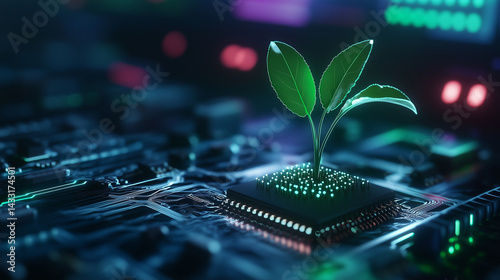 Close-up of a tiny plant emerging from the silicon surface of a computer chip, with technology and nature blending seamlessly, highlighting the future of green, sustainable computi