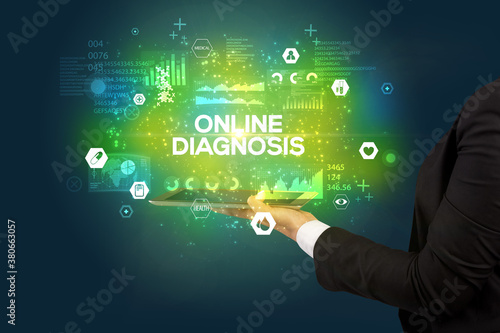 Close-up of a touchscreen with ONLINE DIAGNOSIS inscription, medical concept