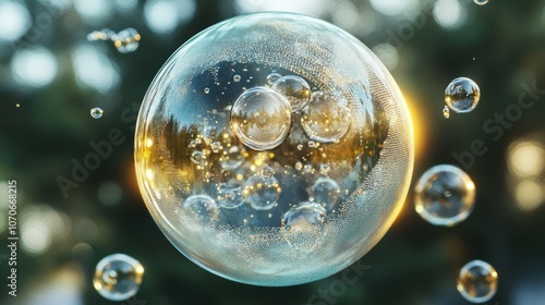 Close-up of a translucent soap bubble with shimmering reflections, surrounded by floating smaller bubbles.