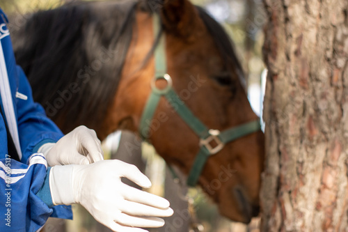 closeup, vet, put, glove, vaccination, treatment, horse, caucasian, person, unrecognizable, preparation, hygiene, medicine, vaccine, disease, prevention, exam, health care, injury, occupation, operation, surgery, medicals, specialist, sterile, uniform, profession, assistant, professional, surgical, doctor, health, people, intervention, vet, emergency, work, veterinary, safety, clinic, health care, putting, latex, wearing, protective, cleanliness