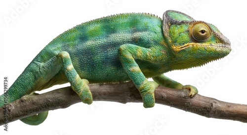 Close-up of a vibrant green chameleon perched on a thin branch with detailed textured skin and large eye, isolated on white background
