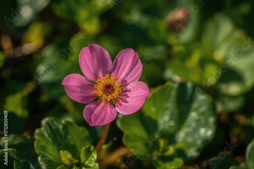 Close-up of a vibrant pink bergenia blossom amidst lush greenery