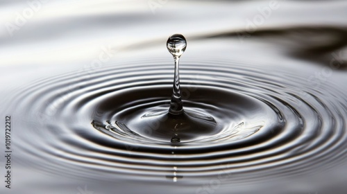 Close-up of a water droplet hitting a dark surface, creating perfect concentric ripples. Concept of tranquility, nature, and minimalism.