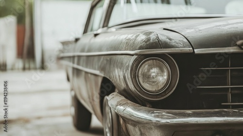 car, vintage, antique, automobile, classic, vehicle, old, retro, rust-eaten, aged, weathered, metal, headlamp, grill, chrome, fender, dust, dirty, paint, texture, surface, worn, detail, front, side, exterior, transportation, history, classic car, auto, transport, drive, road, travel, journey, ride, style, design, grey, dark, shadow, light, day, outside, street
