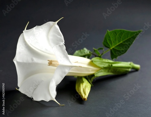 flower, white, bloom, nature, botany, plant, delicate, detail, closeup, isolated, dark, background, green, leaf, stem, tubular, smooth, soft, organic, beauty, contrast, symmetry, flora, fresh, still life, macro, elegant, fragile, natural