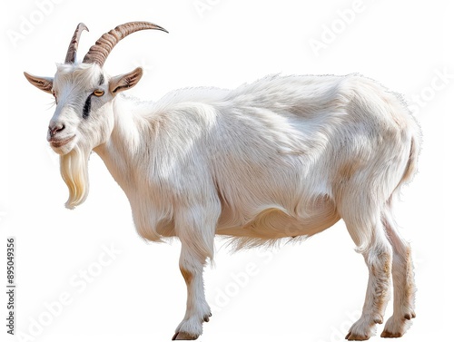 Close-up of a white goat with long horns and a beard standing against a white background. High-resolution stock photo.