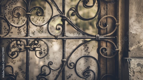 Close-up of a window with a wrought iron door, intricate patterns, natural light, detailed texture, high resolution, vintage style.