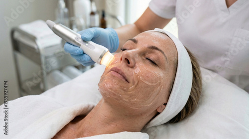 Close-up of a woman receiving a facial skin rejuvenation treatment with a modern cosmetic device in a beauty clinic, professional aesthetic procedure and skincare