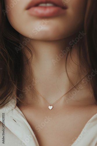 Close-up of a woman wearing a thin gold necklace with a heart pendant. Portrait highlighting a young woman wearing a heart pendant necklace. Love symbol, Saint Valentine's Day gift.