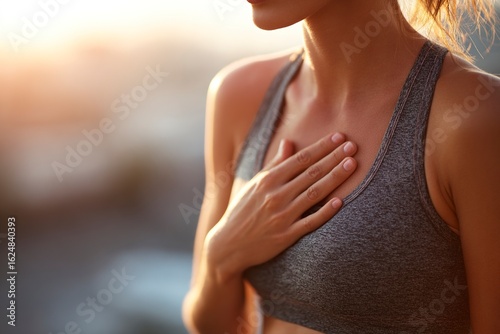 Close-up of a woman with chest pain, holding her hand on the heart area. The color tone is warm and reddish. The background features sunlight and an outdoor setting, with the woman wearing sportswear.