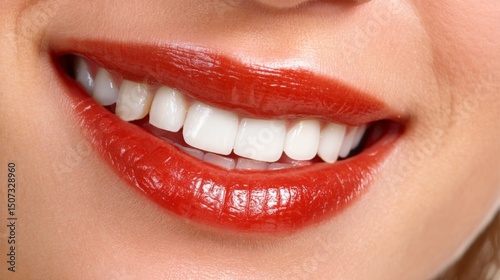 Close-up of a woman's bright smile showcasing white teeth and red lipstick