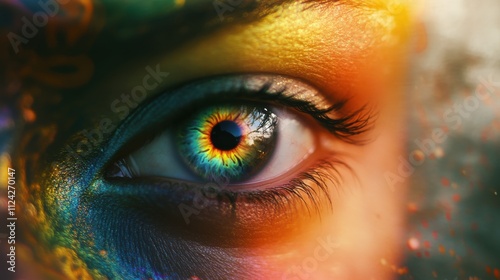 eye, eye, woman, girl, face, make-up, colourful, vibrant, iris, pupil, lash, glistering, gold, cosmic, fantasy, art, beauty, abstract, closeup, detail, macro, texture, skin, light, shadow, mystical, surreal, gaze, look, vision, intense, expression, emotion, feeling, sparkle, shine, pigment, paint, artistic, creative, magical, dreamy, aethereal, portrait