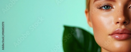 Close-up of a woman’s face showcasing glowing skin, striking blue eyes, and a tropical green background with a leaf.