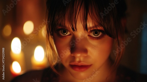 woman, face, closeup, candle, light, brown hair, camera, soft light, shadow, skin, female, candlelight, portrait, illumination, hair, brown, gaze, facial, soft, glow, warm light, candlelight, warm, shadow, light effect, facial features, candle