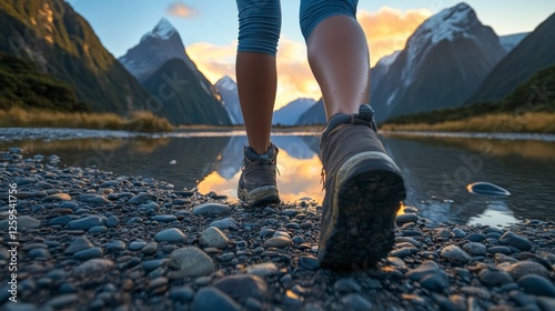 Close-up of a woman's feet in hiking shoes walking on rocky ground near a river and mountains, viewed from behind at sunset