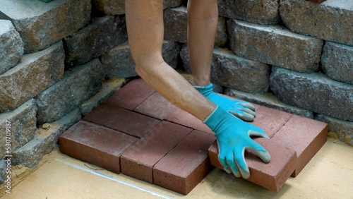 closeup, woman, installing, brick, paver, glove, patio, sand, beautify, landscaping, yard, stone, garden, dirtied, backyard, material, clay, work, natural, start, plant, red, dig, shovel, texture, rural, construction, dirt, earth, ground, summer, homeowner, landscaper, property, landscape, hispanic, trowel, install, tamper, hand, sponge, rough, surface, track, mortar, rock